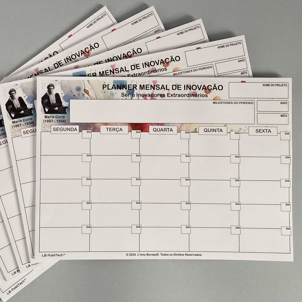 SOBRE O PRODUTO: O Planner Mensal de Inovação é ideal para o planejamento visual, offline, das principais entregas-chaves (milestones) de projetos de Inovação ao longo de 1 mês. Com design exclusivo, pode ser preenchido diretamente e/ou combinado com o uso de blocos adesivos de tamanho pequeno. É uma ferramenta completa para o planejamento estratégico de projetos na prática! Pode ser utilizado para a gestão de 2 projetos por 1 ano, 4 projetos por 6 meses, ou até 8 projetos por 3 meses.